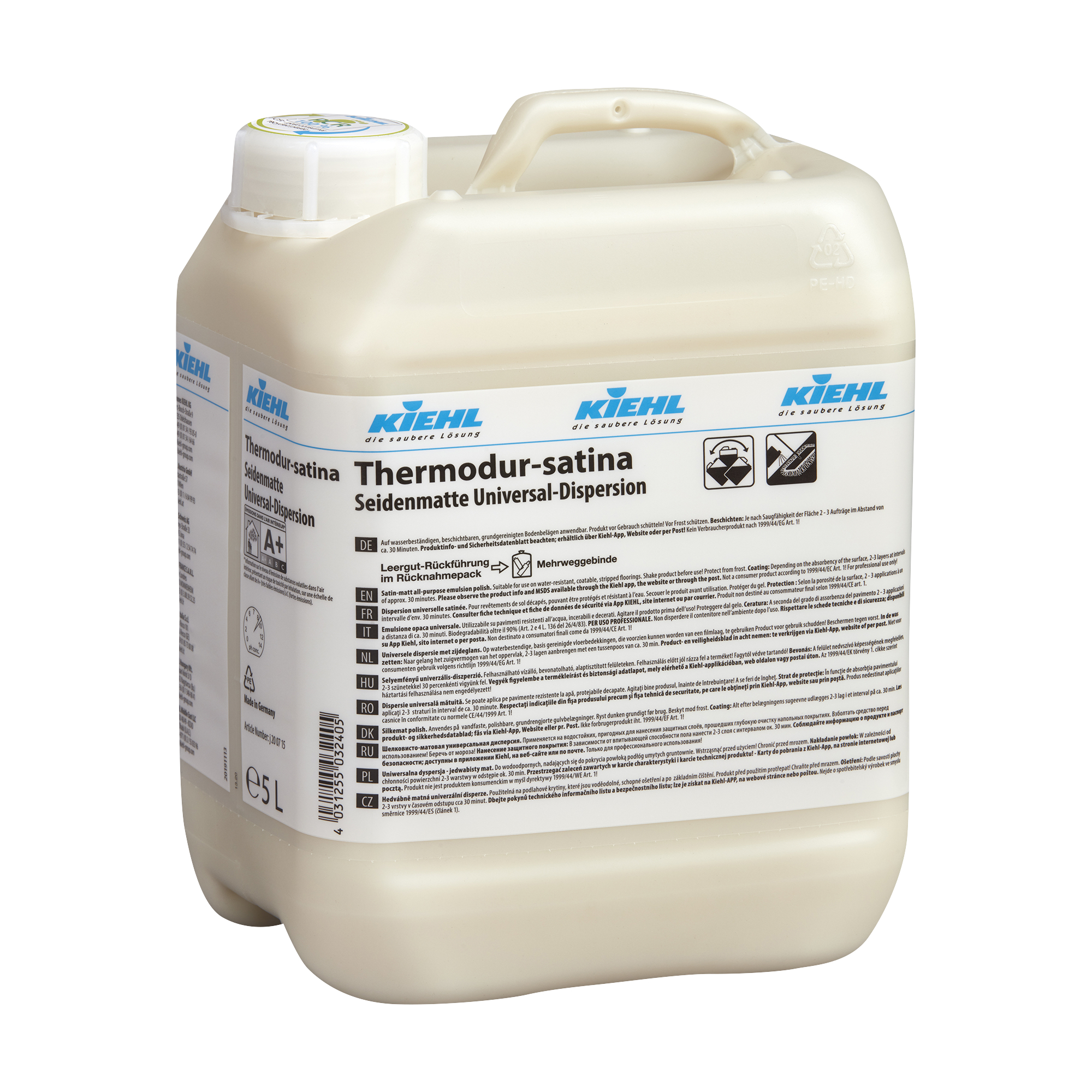Die Kiehl Thermodur-satina ist eine metallvernetzte Kunststoffdispersion mit hohem Feststoffanteil, die einen matten, seidenmatten Film bildet. Dieser bleibt selbst durch Polieren matt und bietet einen strapazierfähigen Schutz für Bodenbeläge. Mit ihren schmutzabweisenden, wischfesten und wasserbeständigen Eigenschaften ist die Dispersion ideal für stark frequentierte Bereiche. Zusätzlich ist sie beständig gegen Flächendesinfektionsprodukte und bietet hervorragende Filmbildeeigenschaften.